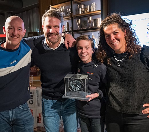 27 november 2023 - Het was een super avond in Scheveningen bij de uitreiking van de NZC-jaarprijzen. De aanmoedigingsprijs voor de jeugd is voor Thijs Keetels (CSi Rakker), hier op de foto met oud-winnaars Sander van der Borch, Simeon Tienpont en Laura van Veen, drie crewmembers van de Fever, de boot die dit jaar de prestigieuze Coolhaas prijs wint.