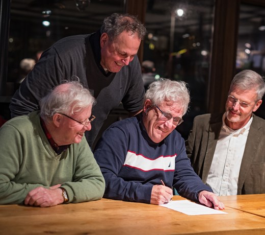 18 januari 2024 - Op de Dag van het Wedstrijdzeilen (25.11.2023) ondertekende Hans Colenbrander de overdracht van SW naar de Noordzee Club. Hans wordt geflankeerd door zijn adviseur en vriend Dirk-Jan Kann en de NZC-voorzitter Peter Tjalma. Willem Ellemeet, voorzitter van de Technische Commissie, voerde de onderhande-lingen met Hans en bedankte hem voor al zijn werk.