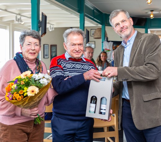 27 maart 2024 - Tijdens de Dag van het Wedstijdzeilen in november was het al aangekondigd, onlangs tijdens de Algemene Ledenvergadering bekrachtigd en afgelopen zondag werd Roy door onze voorzitter Peter Tjalma officieel gefeliciteerd met zijn erelidmaatschap. Daar de ALV van de NZC online plaats vond, gebeurde dit feestelijk tijdens de ALV van Roy's eigen Watersportvereniging Breskens. Zijn vrouw Sari werd in het zonnetje gezet met een mooie bos bloemen.