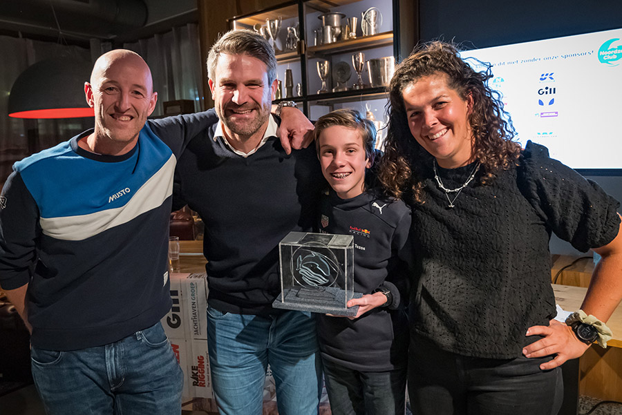27 november 2023 - Het was een super avond in Scheveningen bij de uitreiking van de NZC-jaarprijzen. De aanmoedigingsprijs voor de jeugd is voor Thijs Keetels (CSi Rakker), hier op de foto met oud-winnaars Sander van der Borch, Simeon Tienpont en Laura van Veen, drie crewmembers van de Fever, de boot die dit jaar de prestigieuze Coolhaas prijs wint.