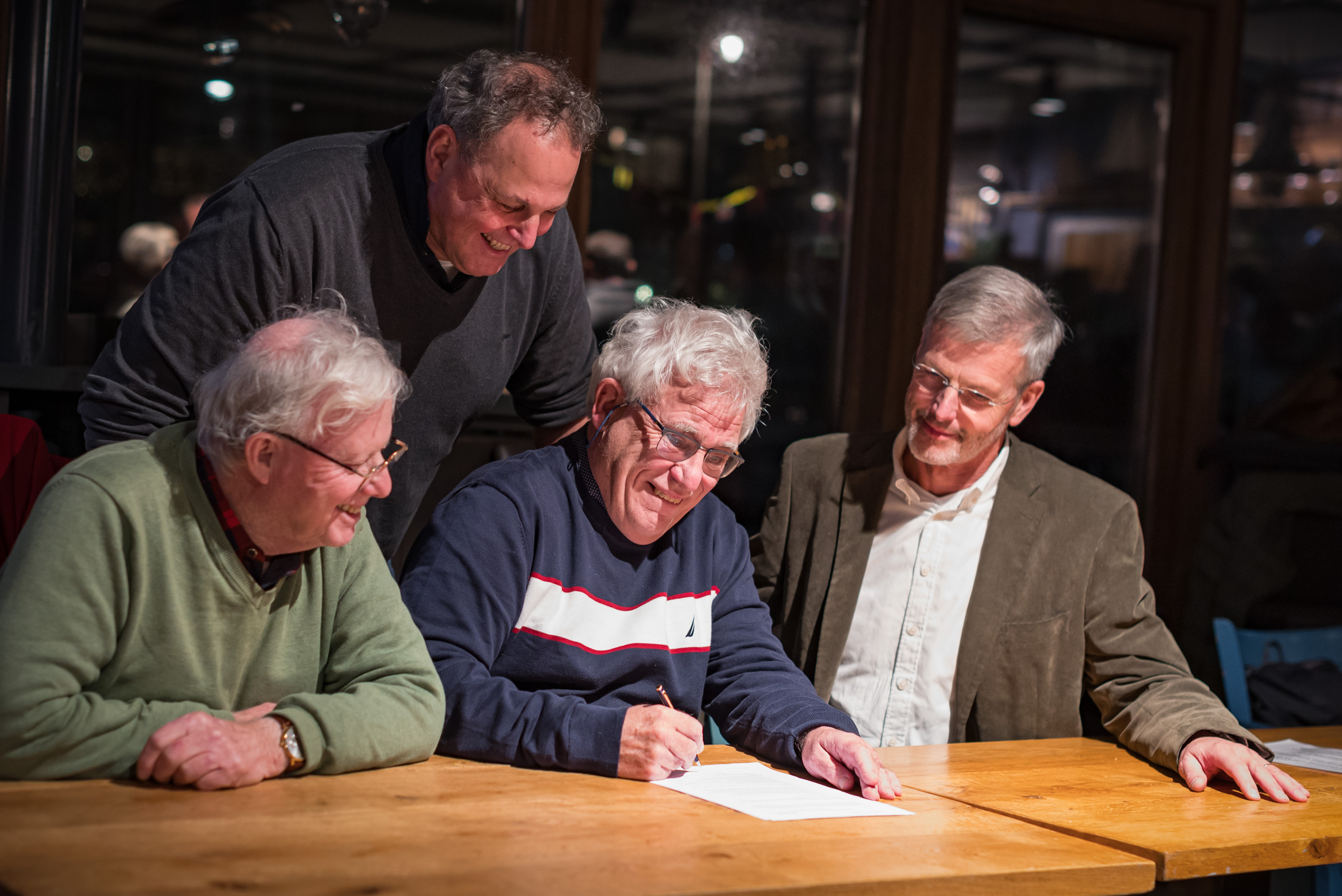 18 januari 2024 - Op de Dag van het Wedstrijdzeilen (25.11.2023) ondertekende Hans Colenbrander de overdracht van SW naar de Noordzee Club. Hans wordt geflankeerd door zijn adviseur en vriend Dirk-Jan Kann en de NZC-voorzitter Peter Tjalma. Willem Ellemeet, voorzitter van de Technische Commissie, voerde de onderhande-lingen met Hans en bedankte hem voor al zijn werk.
